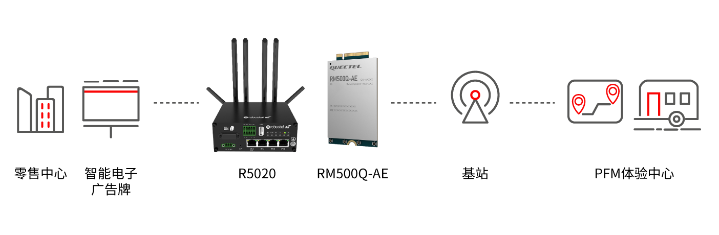 为了使部署在现场的物联网传感器与“PFM体验中心”数据平台之间实现实时通信,PFM集团选择了搭载移远5G模组RM500Q-AE的鲁邦通5G网关R5020。
