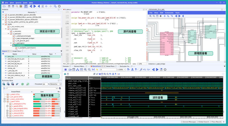 在提供完整调试解决方案的同时,昭晓Fusion DebugTM由创新的设计推理引擎和高性能分析引擎提供动力,能够支持统一且高性能的编译,快速加载仿真结果和信号显示,轻松进行信号连接跟踪和根本原因分析。