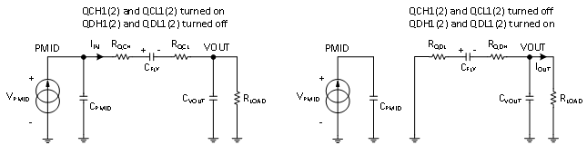 电荷泵快充模式下,输入电压等于2倍输出电压,输入电流只有输出电流的一半,使得输入端传输路径上的功率损耗降低了一半,提高充电效率且降低了对输入线缆的要求。电荷泵工作模式下芯片内部开关工作分两个阶段。阶段1,QCH1(2)和QCL1(2)导通,QDH1(2)和QDL1(2)关闭,等效工作如下图左。阶段2,QCH1(2)和QCL1(2)关闭,QDH1(2)和QDL1(2)导通,等效工作如下图右。阶段1和阶段2,各个开关的导通和闭合各占整个开关周期的50%。