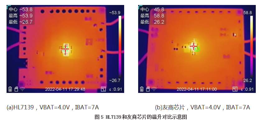 图5为HL7139和友商芯片工作在7A负载条件温升示意图。从图中可以看出,HL7139芯片表面的温升大约为53.9-25=28.9℃(环境温度约为25℃)。友商芯片表面的温升大约为58.8-25=33.8℃(环境温度约为25℃)。HL7139的高效率在芯片温升方面优势明显。