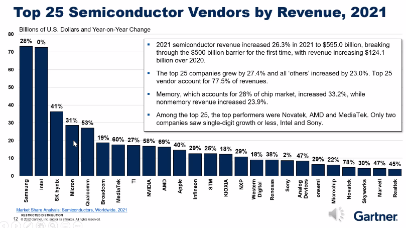 这张图是代表了全球前25位半导体公司的市场表现在去年2021年的市场表现。有些公司把三星放在第一位、英特尔放在第二位,我们是把三星放在第一位。最重要的原因,是英特尔有一部分是非半导体的营收,我们要把这一部分给拿掉。拿掉之后,它就比三星稍微低一点。大部分的厂商都是增加的,而且是增加比较多的。比较少增加的,其实是两个公司:一个是英特尔,一个是索尼。这两个公司主要就是因为英特尔去年的市场份额被MD和苹果占掉蛮大的,对于它整个业绩有一定的影响。索尼是因为华为,华为这一块的份额没有之后,对于它的业绩也是有比较大的影响。整体的来看,前20位的公司是成长27.4%。前25位的公司,其实是占了77.5%的市场总体营收份额。前面的前10位,大的Memory公司都在这里面。包括三星、SK hynix、Micoron、KIOXIA。表现比较突出的,像联发科、AMD、英伟达,这几个公司都是表现非常突出。联发科手机芯片,去年它的手机芯片5G增长非常快,其实也占了高通供应不上、上游不给力的机会,找准机会占有市场比较大的份额。Realtek也是台湾公司,它的机会其实也是大陆的这些电视机厂商、液晶屏的厂商,它也是抓住了这个增长的机会。特别是去年上半年缺货比较厉害,导致它的价格也是有一定的上升。AMD表现非常好,它在服务器芯片上面突破了英特尔的垄断。现在整个形势来看、英特尔应该是非常着急,对于AMD的进攻是非常着急。英伟达主要的增长,我们看两方面:一方面,GPU挖矿。GPU挖矿去年很好,然后它又出来了一个专门的挖矿芯片,之后它的GPU“挖矿”的需求下来了,但是专用于“挖矿”芯片的业绩也是增长蛮快的。更大的一块,是来自于多数据中心。去年它有推出新的一些数据中心专用的AI加速,包括一些网络芯片,这方面支撑了业务的快速增加。