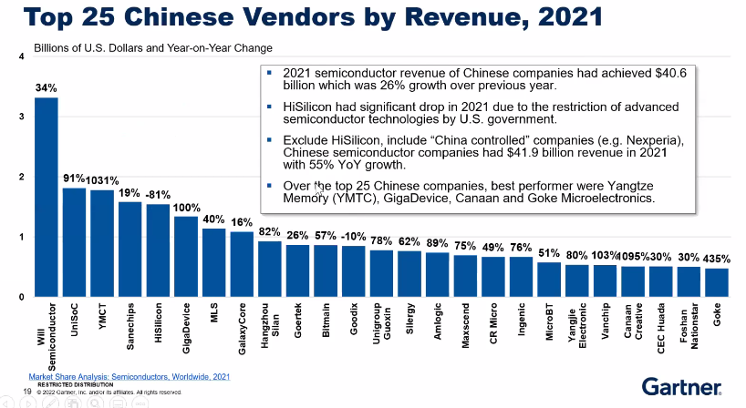 我们可以看一下,中国半导体市场的份额前25位来看,韦尔半导体去年业绩排榜首,差不多有三个多Billions的营收,过去这是海思的位置,它取代了海思成为了国内最大的半导体厂商。然后我们看其它的公司,前25位的其它公司最后一位差不多也要有差不多5亿美金的水平,这个比之前、我们讲前几年的“截止线”应该是高了很多。我记得十年前前十位的中国半导体公司差不多营收就是两亿美金左右就可以上榜。然后不断的提升,三亿、四亿,然后现在没有个五亿、六亿,你是上不了前十的。整体的市场去年你非常好,绝大部分公司都是增长非常快,海思除外。海思为什么下降81%?这个原因大家都知道。讲的哲学一点,其实就是整个市场有一个这种现象“一鲸落,万物生”。