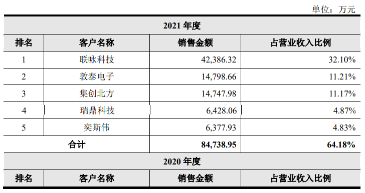 2019年-2021年颀中科技前五大客户销售收入分别是6.04亿元、7.12亿元、8.47亿元,占总销售额的比例是90.25%、82.01%、64.18%。