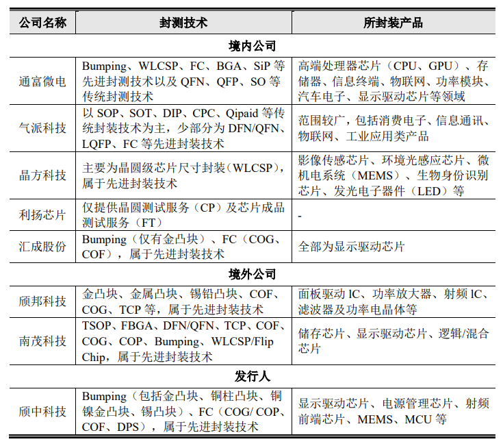 在封测技术和封装产品对比情况如下: