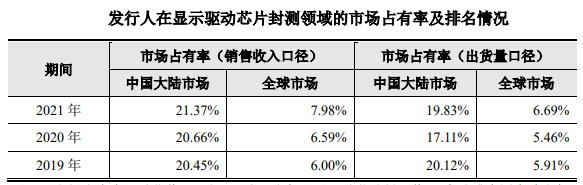 在显示驱动芯片封测领域,颀中科技在行业内具有领先地位及影响力。根据赛迪顾问的数据,最近三年,颀中科技的显示驱动芯片封测收入及封装芯片的出货量均位列国内第一、全球第三。同时也是近三年收入规模最高的显示驱动芯片封测企业,其显示驱动芯片封测业务近三年累计收入超26亿元。