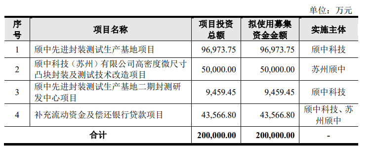 此次募投20亿元,主要用于“颀中先进封装测试生产基地项目”、“颀中科技(苏州)有限公司高密度微尺寸凸块封装及测试技术改造项目”、“颀中先进封装测试生产基地二期封测研发中心项目”和补充流动资金及偿还银行贷款项目。