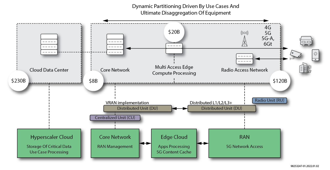 5G不再只是一种RAN,而是需要包含从客户端到数据中心整个网络连接的技术。从历史上看,智能位于蜂窝网络的任一端,包括客户端、基站和核心网络。随着我们向万亿台互联设备迈进,MNO无法再增加越来越多的容量,以便将数据从无线电传输到数据中心进行应用处理,然后再返回到客户端设备。例如,联网的图像传感器数量从今天的4亿只增加到10亿只,那么网络流量将从今天的大约150 EB增加到400 EB。