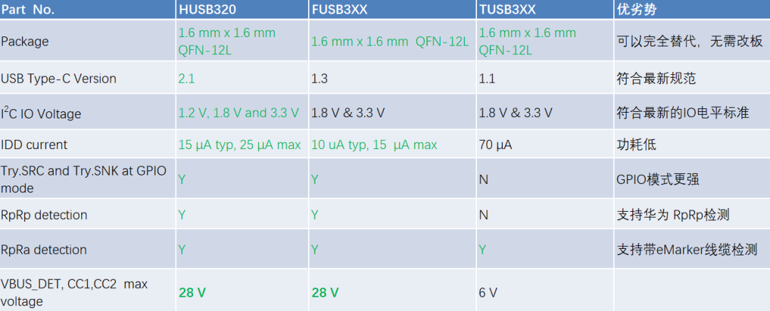 将HUSB320与市面上同类型产品(FUSB303B、TUSB320等)做对比,其具有高耐压、低功耗、满足最新USB Type-C 2.1规范、符合最新的IO电平标准等优势。它采用1.6 mm x 1.6 mm QFN-12L封装,可替代其他同类型产品。