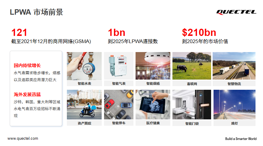 在LPWA市场中,数据显示,截至2021年12月已拥有121个商用网络(GSMA),到2025年LPWA连接数将达到10亿个,市场总值将达到2100亿美元。国内的水气表需求巨大,烟感及追踪类应用潜力巨大。