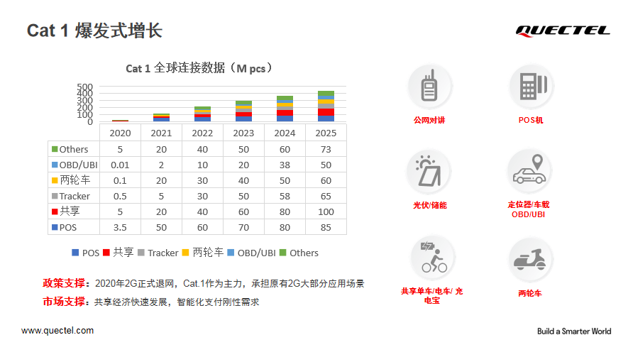 林佳认为,5G技术发展并不意味Cat 1就不需要了,相反Cat 1市场正处于爆发式增长,预计到2025年全球连接数据将达到4亿个。其应用场景主要集中在公网对讲、pos机、光伏/储能、定位器/车载OBD/UBI、共享经济、两轮车等,移远的Cat 1模组产品也能满足这些市场的行业应用需求。