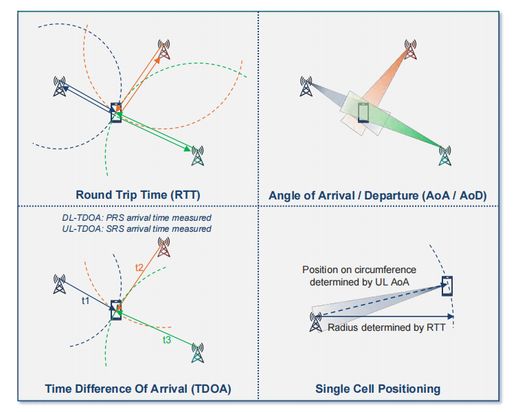 在UR定位上,R16提供室内3米和室外10米的精度要求,而且新的定位参考信号(PRS)允许检测到更多的邻近传输点。单个单元定位采用AoA+RTT,多单元定位则有很多途径,例如RTT、AoA/AoD、TDOA。