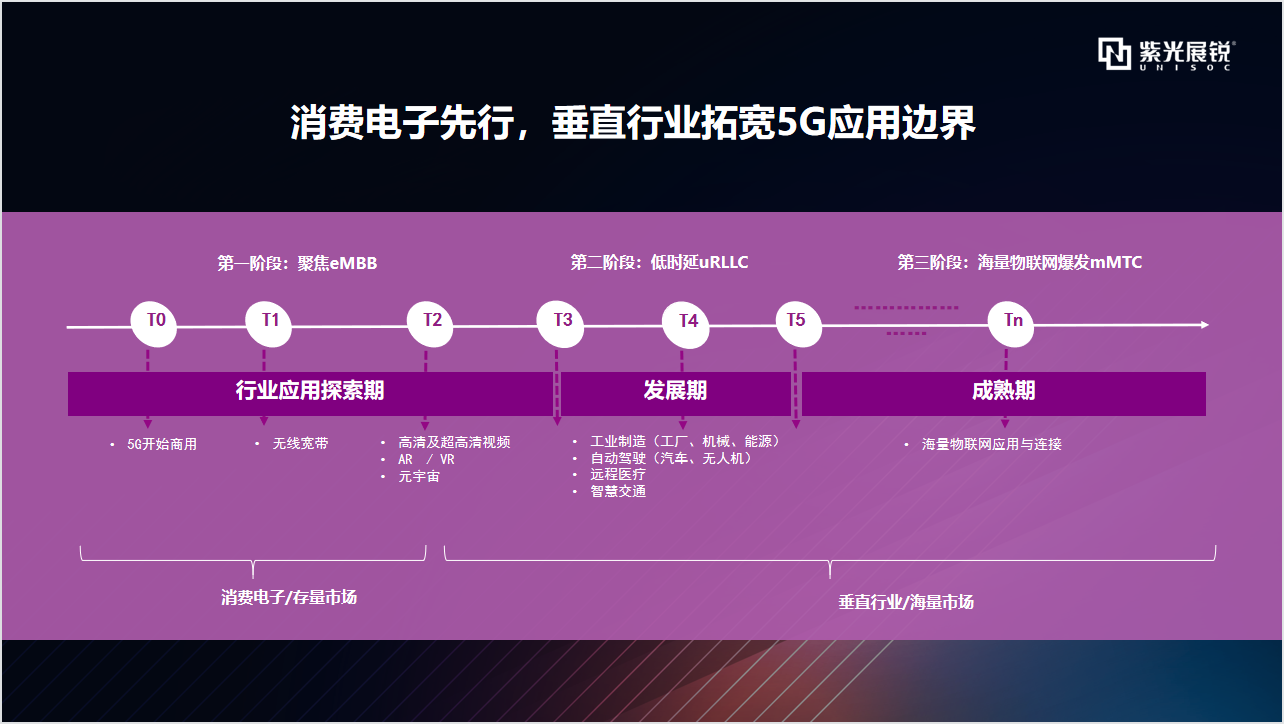 第一阶段 是行业应用探索期,在这个阶段5G开始商用,在eMBB应用的基础上进一步衍生至固定无线宽带接入和高清及超高清视频、AR/ VR、元宇宙等行业应用,但主要还是以消费电子产品为主。