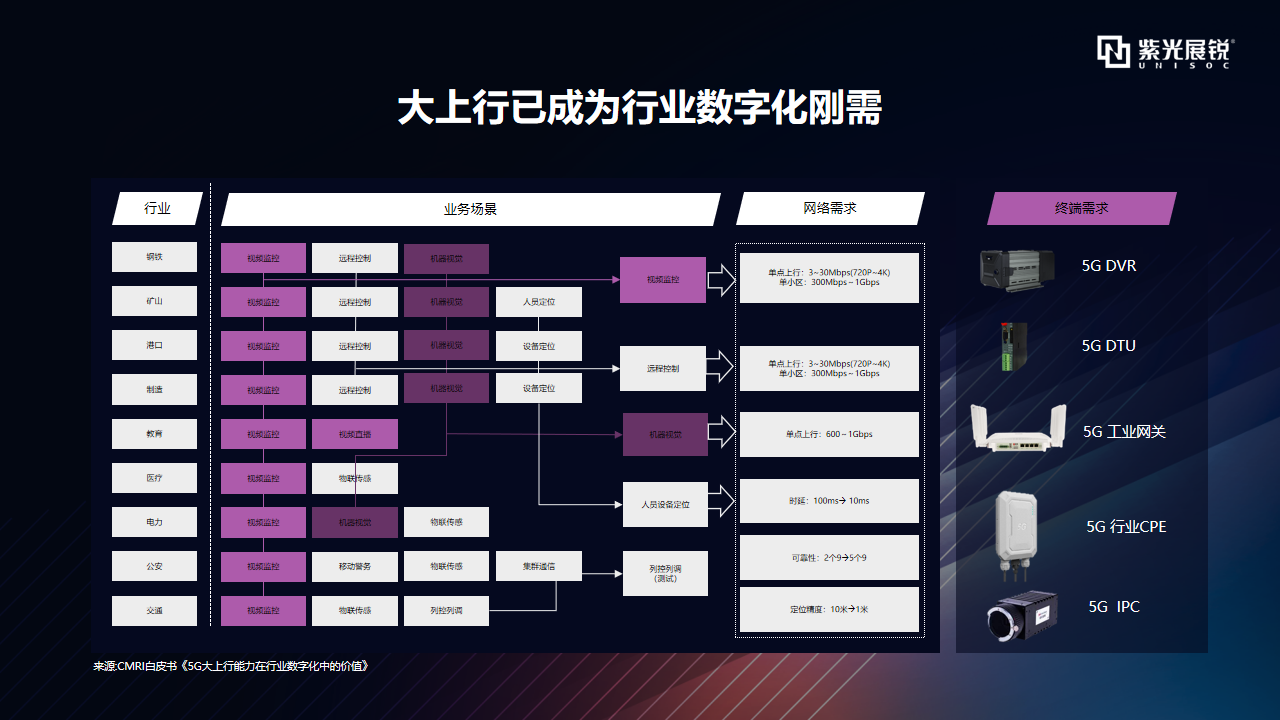 从当下的市场需求来看,5G在视频领域的应用率先爆发,同时往更多场景、领域应用,催生终端形态的多样化。值得关注的是,不同的行业对于网络以及终端都有不同的需求。例如需要视频监控业务场景相应的网络需求是单点上行3~30Mbps(720P~4K),单小区300Mbps~1Gbps;而机器视觉的业务场景对于终端上传能力有较大的挑战,单点上行为600~1Gbps;需要人员设备定位的业务场景时延需求为100ms到10ms。可以很明显地感受到,钢铁、矿山、教育、医疗等行业数字化的5G需求日益凸显,不同的业务场景、网络需求带来了5G DVR、5G DTU、5G 工业网关等终端产品。