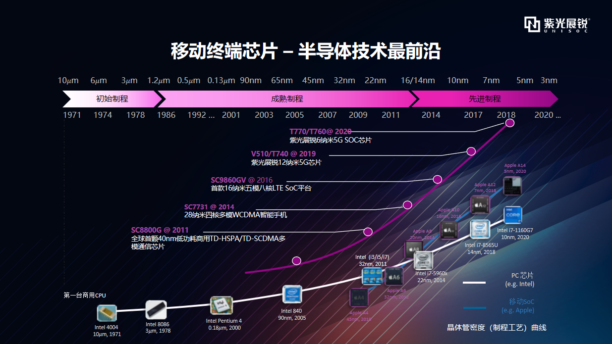 在2011年,紫光展锐推出了全球首颗40nm低功耗商用TD-HSPA/TD-SCDMA多模通信芯片SC8800G,2014年推出首款16纳米五模八核LTE SoC平台 SC9860GV ,2019年推出12纳米5G芯片V510/T740,在2020年推出6纳米5G SOC芯片T770/T760。***提到,紫光展锐的6nm产品家族将在去年实现商用,为移动终端用户以及行业客户提供更高集成度,更低功耗的产品。
