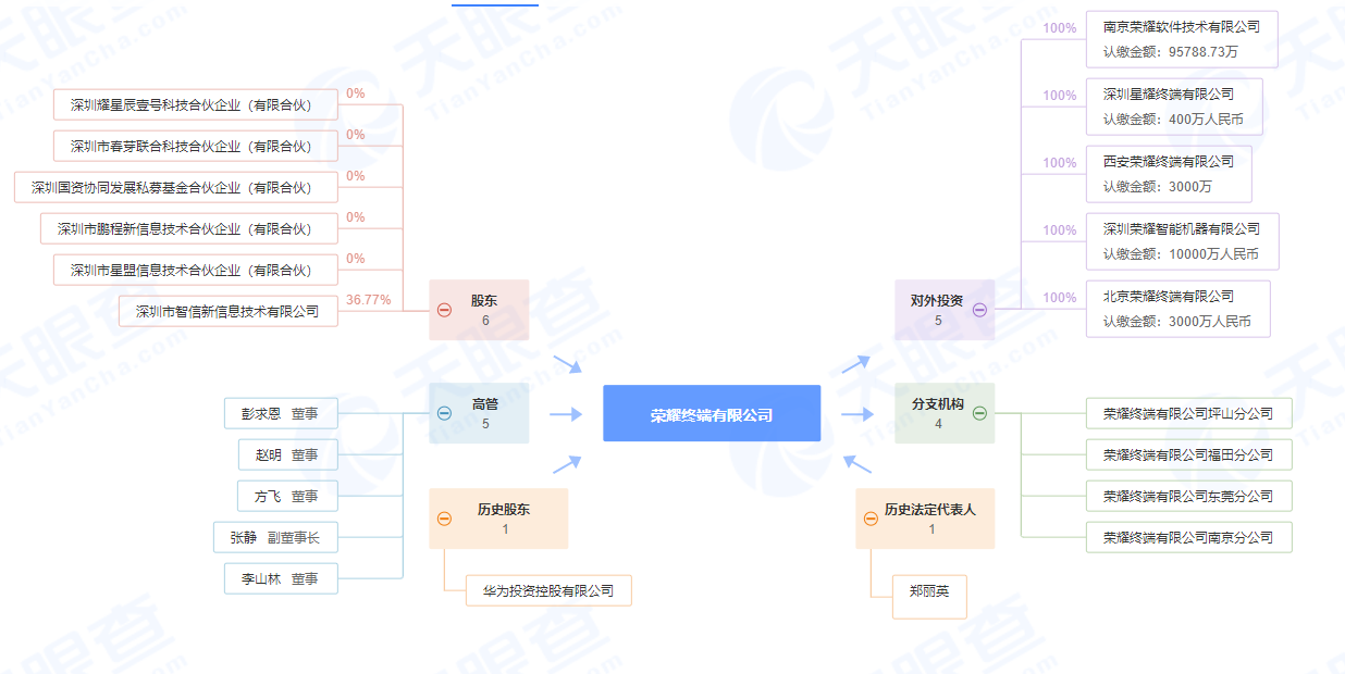 目前,荣耀终端有限公司对外投资了5家公司,分别是南京荣耀软件技术有限公司、深圳星耀终端有限公司、西安荣耀终端有点公司、深圳荣耀智能终端有有限公司、北京荣耀终端有限公司,注册资本分别为95788.73万元、400万元、3000万元、10000万元、3000万元。基于荣耀的业务在不断拓展,控股公司的数量在未来或许还会进一步增加。