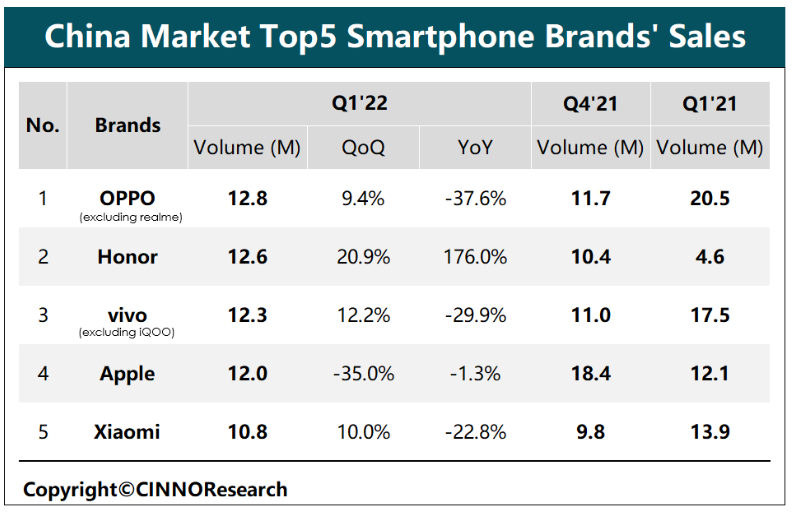 与此同时,荣耀在智能手机市场上的表现就像是一匹黑马。CINNOResearch数据显示,在2022年Q1,中国大陆市场智能手机销量约为7,439万部,较去年同期下滑14.4%,较去年第四季度环比微增0.7%。而荣耀在中国市场手机出货量达到1260万部,环比增长20.9%,同比增长176.0%。距离第一位的OPPO只有200万台差距。作为对比,OPPO、vivo、小米的销量同比下滑幅度在二至四成不等。荣耀重返国内手机第一梯队,可见荣耀的产品策略、渠道和消费者接受度都表现不俗。