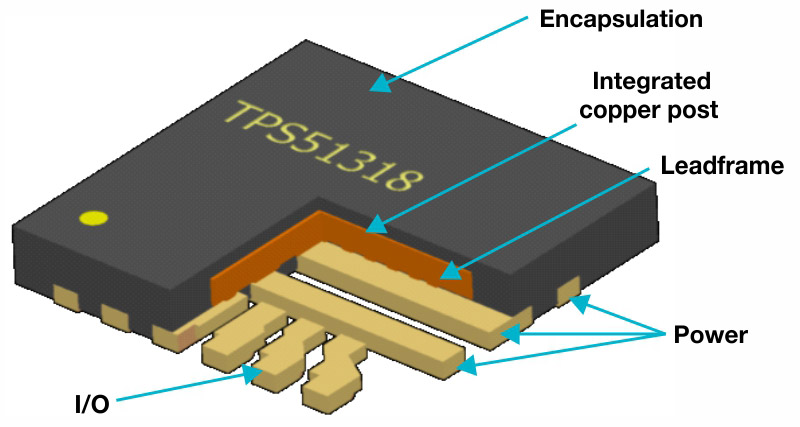 这些无引线塑料封装使用铜柱将芯片连接到封装,因为这种方法比键合线需要的空间小,从而可以尽可能减小封装尺寸。铜柱还支持高电流电平,并且为电流路径增加的电阻极小,允许单个引脚传输高达6A的电流。