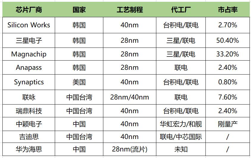 此外,2021年华为海思自研的40nm或28nmOLED驱动芯片已经试产完毕,芯片样本已经送至京东方、华为、荣耀等厂商处进行测试。2021年10月,联咏的OLED驱动芯片制程由从40nm转移到28nm,包括国内终端厂商荣耀逐渐开始采用先进的28nm的OLED驱动芯片,整体看来,今年联咏OLED驱动芯片市场份额有望进一步提升。