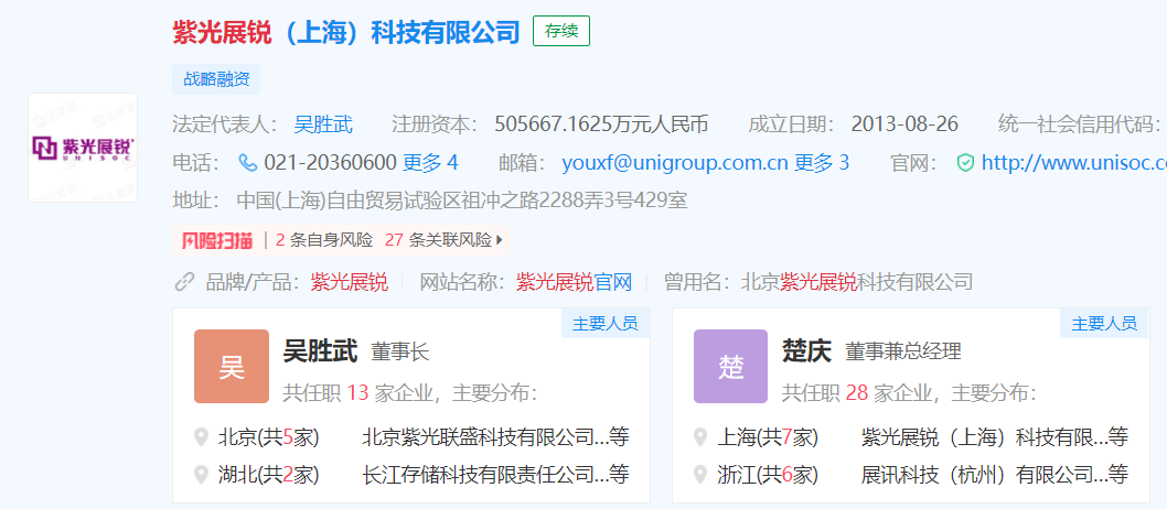 科技有限公司(以下简称:紫光展锐)发生信息变更,法定代表人由赵伟国变为吴胜武,楚庆依然是董事兼总经理。