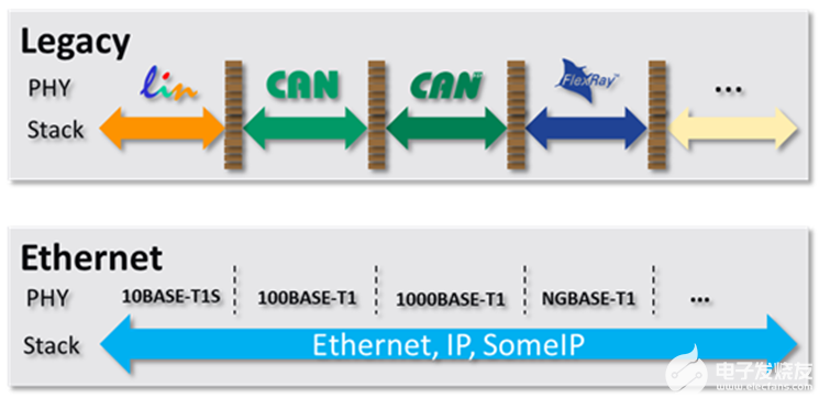 汽车行业的愿景是向全以太网 SDV 迈进,具有联网的区域 ECU、传感器和由中央 ECU 控制的设备。与成熟的公司相比,这种迁移对于新制造商来说更容易。新建环境可以立即全部投入使用,以便轻松采用全以太网方法。对于其他汽车制造商而言,迁移到全以太网车辆可能需要时间,这需要 SDV 包括 CAN、LIN 和其他总线的混合网络架构,以便通过主要以太网骨干网与某些组件进行本地连接。