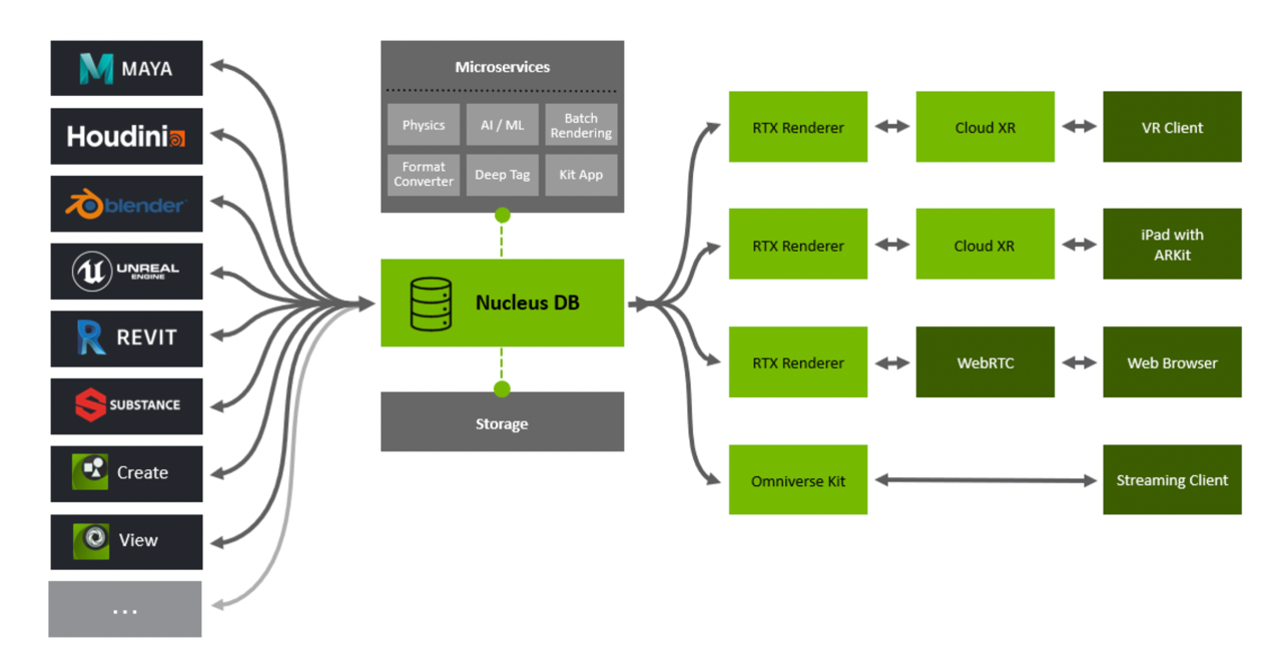 Omniverse的基石是Nucleus,一套连接用户、实现3D资产交换和场景描述的数据库引擎,以通用场景描述联合软件生态,再结合合成、渲染、动画引擎和CloudXR充分凸显自己在图形软件和硬件上的独到优势,英伟达的Omniverse和GPU成了不少元宇宙拓荒者的首选。