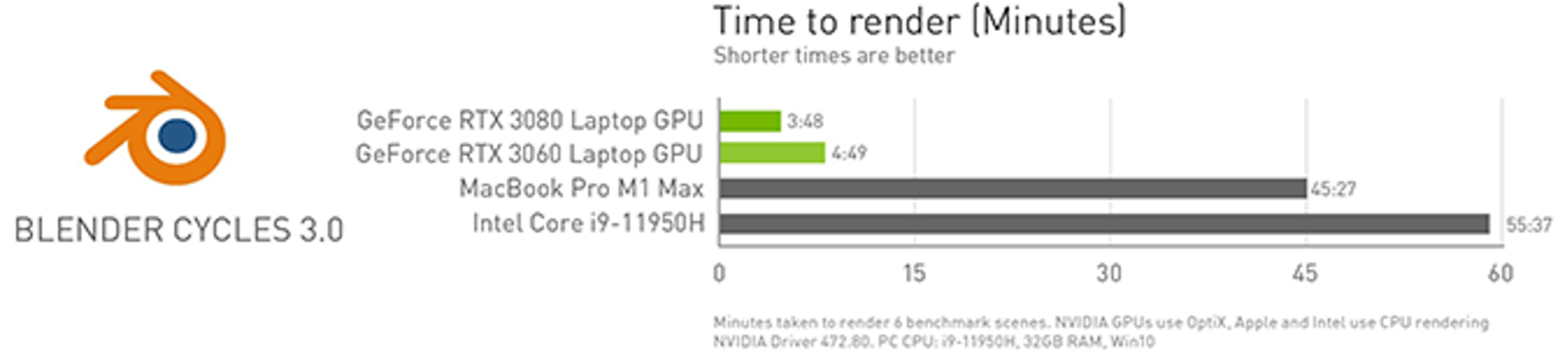 Blender 3.0 Cycles下的渲染时间对比 / 英伟达