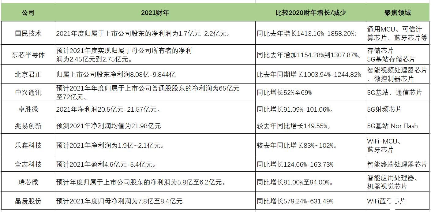 5G和IoT领域近10家芯片公司2021年业绩预告