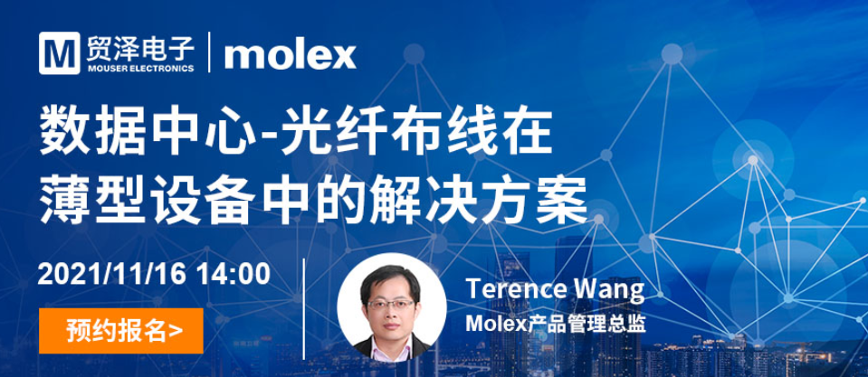 2021年11月10日-专注于引入新品推动行业创新的电子元器件分销商贸泽电子 (Mouser Electronics) 宣布将携手Molex于11月16日14:00举办主题为“数据中心 - 光纤布线在薄型设备中的解决方案”的在线研讨会。届时,来自Molex的技术专家将为大家带来FlexPlane光纤布线方案,帮助工程师提高光纤布线设计时的灵活性,完善综合布线系统的整体性能。