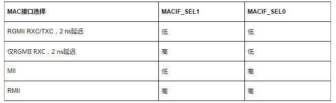 选择使用哪种MAC接口有两种方法:通过硬件绑定外部电阻,或使用软件寄存器配置。MACIF_SEL0和MACIF_SEL1是ADIN1300内的多功能引脚(更多信息参见ADIN1300数据手册)。对于CN-0506,可以根据表1配置MACIF_SEL0和MACIF_SEL1引脚以选择MAC接口。请注意,MACIF_SEL0和MACIF_SEL1引脚内部有弱下拉电阻。因此,如果没有外部绑定电阻,则默认MAC接口为2 ns延迟的RGMII。