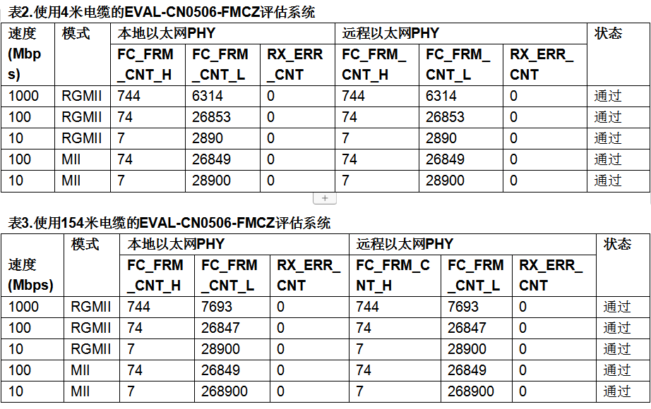 EVAL-CN0506-FMCZ在不同模式下进行了测试,电缆长度逐渐增加。4米电缆和154米电缆的结果已在表2和表3中分别详细列出,没有丢包。