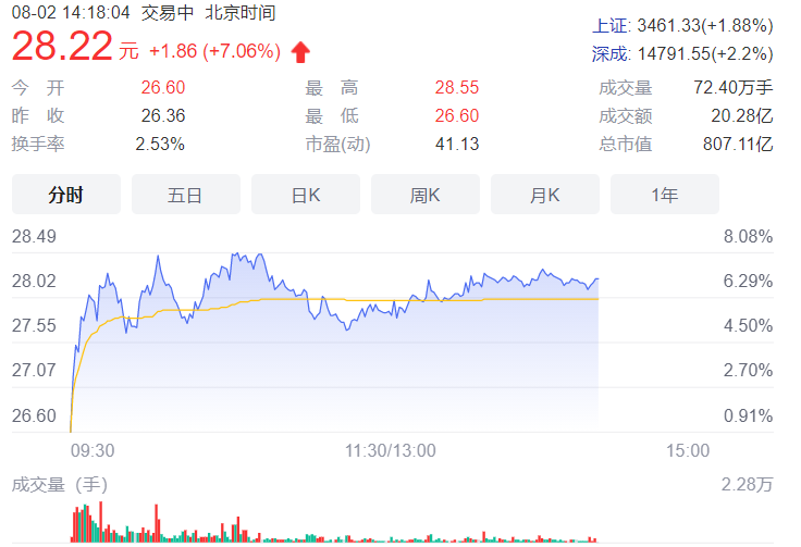 受此消息影响,8月2日紫光股份股市明显走高,盘中一度涨超8%报28.55元。截止到笔者撰稿时,紫光股份涨幅仍然超过7%,市值坚守到800亿元以上的规模。