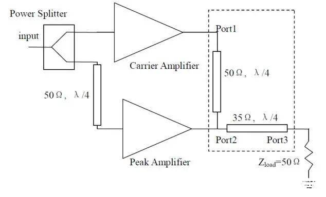其结构如图,Doherty放大器通常情况下使用两个完全相同的放大管来对信号进行放大。限于篇幅,其工作原理无法展开细说。它最大的特点是,放大器在输出功率低于饱和功率6db时的效率,与输出饱和功率时的效率相当。