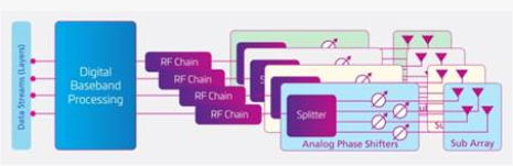 另一种被称为子连接波束形成体系结构的方法更适合于手机和其他应用程序,如汽车。在子连接波束形成中,每个射频信号链仅连接到可用天线的一个子集。这使得子连接架构更简单、更节能,但它的频谱效率较低,不适合频谱效率很重要的大型安装领域。