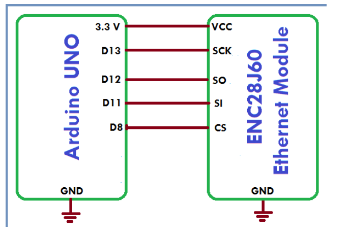 路由器应与LAN连接,并应具有多个输入输出端口。从路由器将一根以太网电缆连接到计算机系统,将另一根以太网电缆连接到ENC28J60模块。同样,ENC28J60模块连接到Arduino。 Arduino和ENC28J60之间的连接如下。