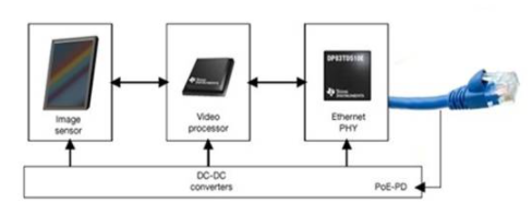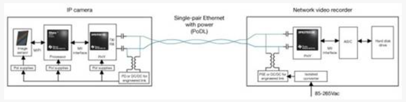 单线对以太网(SPE)网络还支持通过视频监控应用中的低通滤波器沿着同一根单线对电缆进行数据线供电(PoDL),如图2所示。