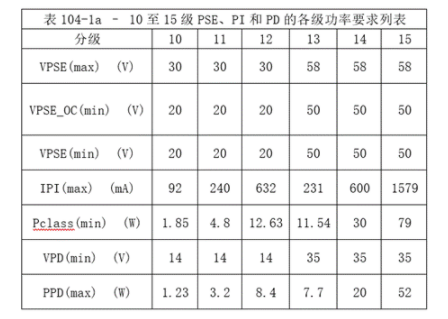 表1列出了IEEE 802.3.cg标准支持的各种功率等级。可向负载提供的最大功率为52W,定义为15级。IEEE 802.3.bu涵盖了低于10的功率等级。