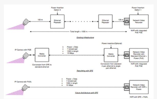 IP摄像头中的标准以太网接口受规范所限制,仅支持100m的电缆传输距离;然而,有一种新技术可以将最小电缆长度增加到1,000m。IP摄像头到网络视频录像机的距离可以是1km或更长,而通过标准以太网在上述距离实现连接需要用到中继器或光纤电缆。一种替代方法是使用同轴电缆(RG-59)来达到更长的距离,但这需要使用无源适配器将以太网信号从CAT 5e转换到同轴电缆,反之亦然。每100m同轴电缆的成本往往高于标准以太网电缆的成本。