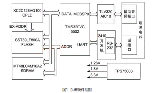 短波动态频谱接入系统的硬件组成部分主要包括:TMS320VC5502 数字信号处理器、音频信号处理模块以及外部存储器等部分。