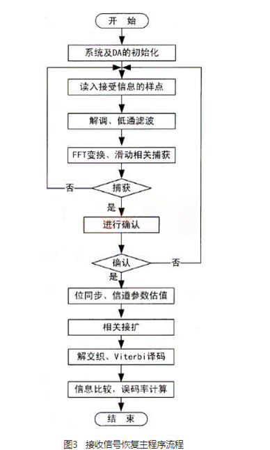 在没有通信任务的状态下,系统持续地监测信道上有没有高过门限的有效信号序列。如果发现信号,系统开始对信号进行捕获。当第1 次出现峰值大于门限时,记录此时的频差估计值,然后作3 次确认。若3 次确认中的峰值大于门限的少于2 次,或者频差估计值之间的差值超出允许的范围,则认为捕获无效,系统重新开始搜索; 若确认过程中大于门限的峰值次数和频差估计值之间的差值在允许范围内,则进行位同步和信道估计。在位同步过程中,通过与本地序列的滑动相关来实现位同步和信道估计,并对多次估计值的结果进行适当处理,获得最终的位同步和信道参数估值结果。根据位同步结果,通过采用分集接收、相关解扩、解交织和解码获得原始信息,完成一次接收。根据前导序列的对比可获得信道误码率,其软件设计流程如图3 所示。