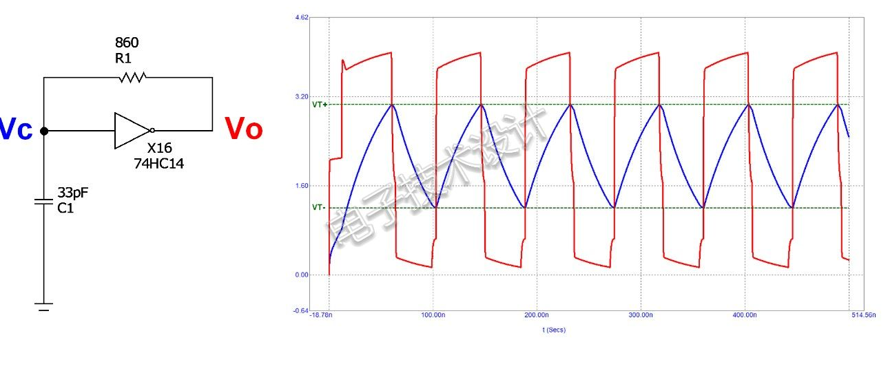 施密特数字触发器具有内置的迟滞(约2V),阈值电压为VT+(3.0V)和VT-(1.2V)。R1与电路连接构成正反馈环路而产生振荡。当Vc小于VT-时,Vo变高并开始通过R1(返回)对电容器C1充电。当Vc超过阈值电压VT+时,Vo变低,C1通过R1开始放电。如果Vc超过阈值电压VT-,则又会重复上述步骤,这样就产生了振荡输出。理想情况下,使用这种配置,可以获得大约30MHz的最大频率。