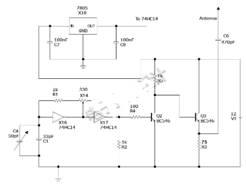 本文所示的原理图是构建功能更强大的发射机的基础。所有TX均基于小功率振荡器,功率更大的电路则跟随其后。不能使用74HC14的替代IC(只有74HC14非常相似)。