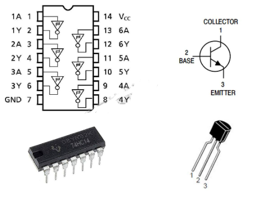 在图3中,可以看到数字非门74HC14和NPN晶体管BC546的引脚排列。