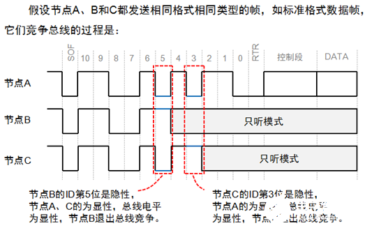CAN总线控制器在发送数据的同时监控总线电平,如果电平不同,则停止发送并做其他处理。如果该位位于仲裁段,则退出总线竞争;如果位于其他段,则产生错误事件。