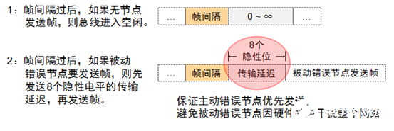 为防止某些节点自身出错而一直发送错误帧,干扰其他节点通信,CAN协议规定了节点的3种状态及行为