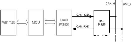 CAN收发器和控制器分别对应CAN的物理层和数据链路层,完成CAN报文的收发;功能电路,完成特定的功能,如信号采集或控制外设等;主控制器与应用软件按照CAN报文格式解析报文,完成相应控制。