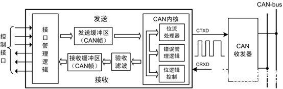 接口管理逻辑:解释MCU指令,寻址CAN控制器中的各功能模块的寄存器单元,向主控制器提供中断信息和状态信息。