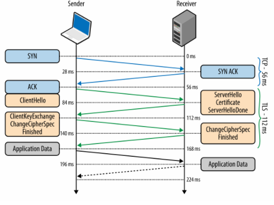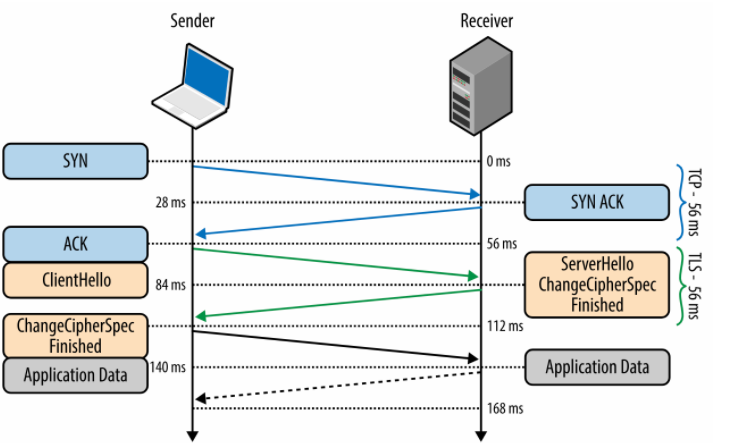 0 ms:TLS运行在TCP基础之上,这意味着我们必须首先完成TCP 三次握手“ ,这需要一个完整的来回交互(RTT)。