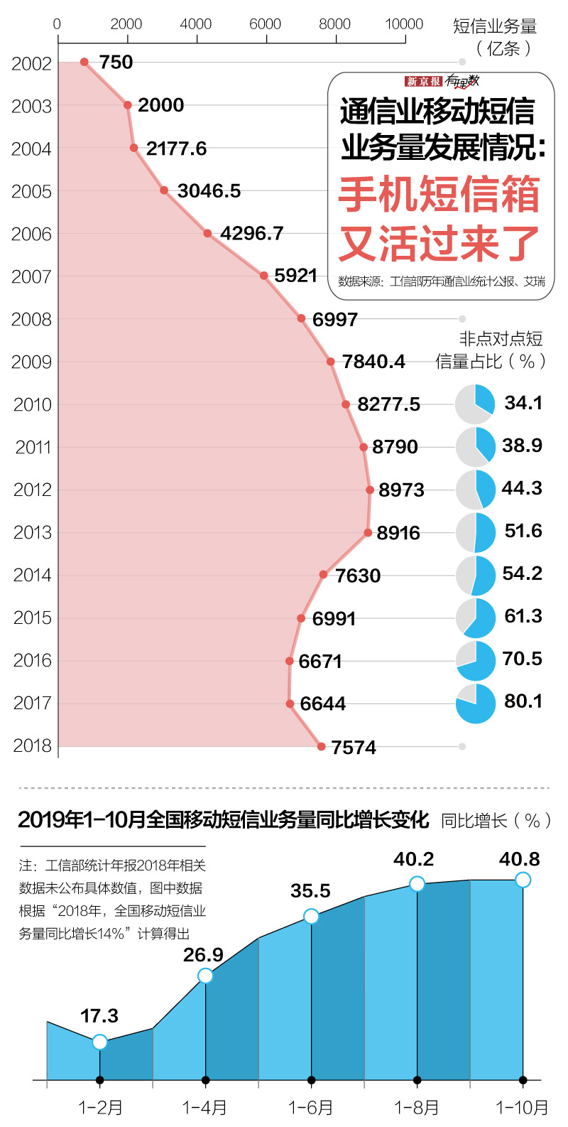 工信部在《2018年通信业统计公报》和《2019年前三季度通信业经济运行情况》中均有解释到,在服务登录和身份认证等应用服务普及带动下,移动短信业务的业务量和收入保持同步增长。