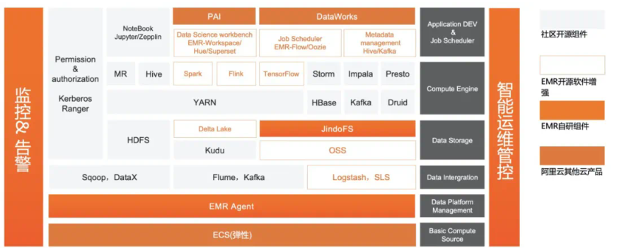 图1是基于ECS底座的EMR架构,这是一套非常完整的开源大数据生态,也是近10年来每个数字化企业必不可少的开源大数据解决方案。