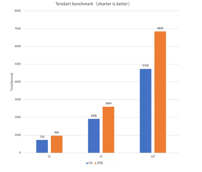 我们在这里展示一下关于性能的成绩,图4和图5是Terasort Benchmark。之所以选取Terasrot这种workload来测试,是因为它只有3个stage,而且是一个大Shuffle的任务,大家可以非常有体感的看出关于Shuffle性能的变化。